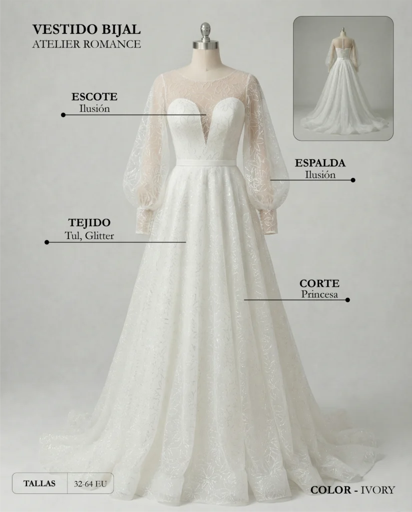 | Estilos de boda | El vestido BIJAL es perfecto para bodas románticas, elegantes y festivas. Ideal para recepciones en salones, fincas con iluminación nocturna, o bodas de estilo campestre-glamuroso. Su brillo es espectacular en bodas de tarde-noche. |