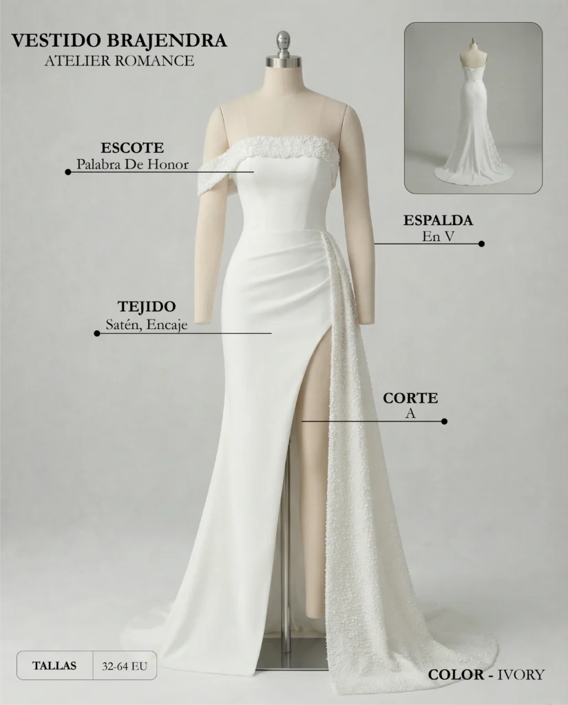 Siluetas favorecedoras El corte A con abertura y escote palabra de honor es ideal para figuras reloj de arena y rectangular que quieren enfatizar sus curvas y hombros. La abertura alta alarga visualmente las piernas y la cola lateral aporta un equilibrio sensual y glam.
