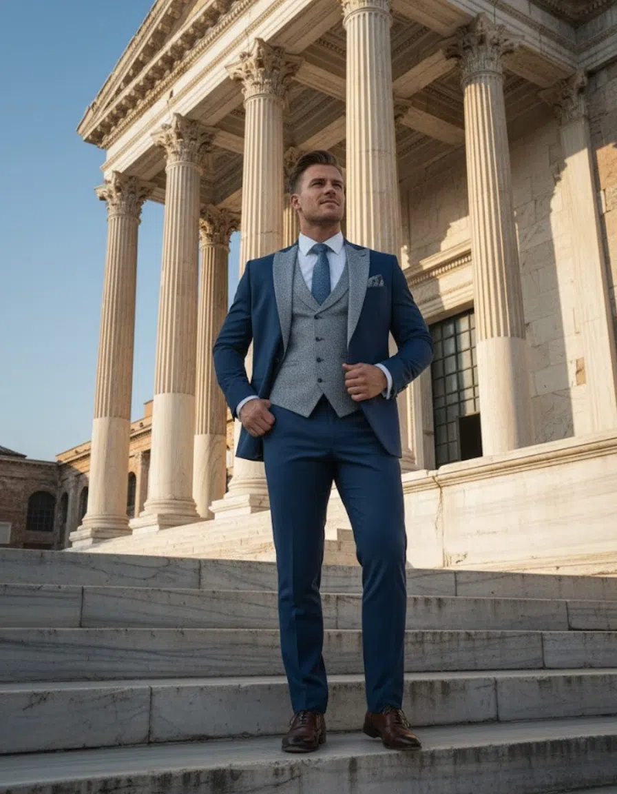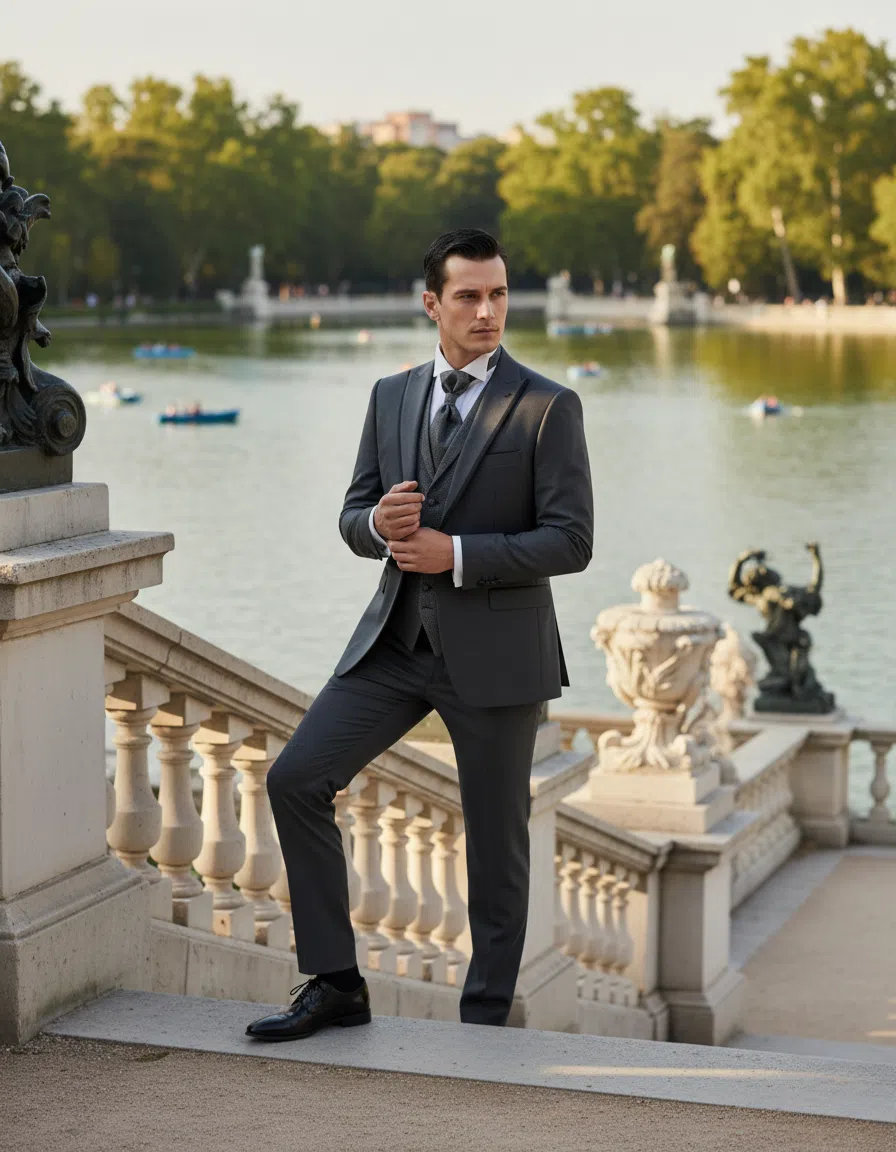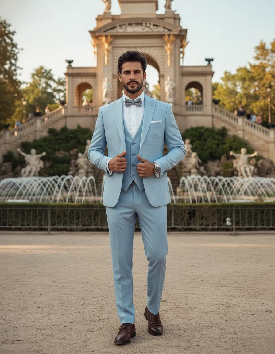 Planificación Combina con zapatos marrón cuero o avellana, complementos en tonos marfil o arena, y boutonnière floral en blanco o tonos pastel. El traje Leonid es la elección ideal para el novio que busca proyectar una imagen equilibrada entre elegancia clásica y frescura contemporánea