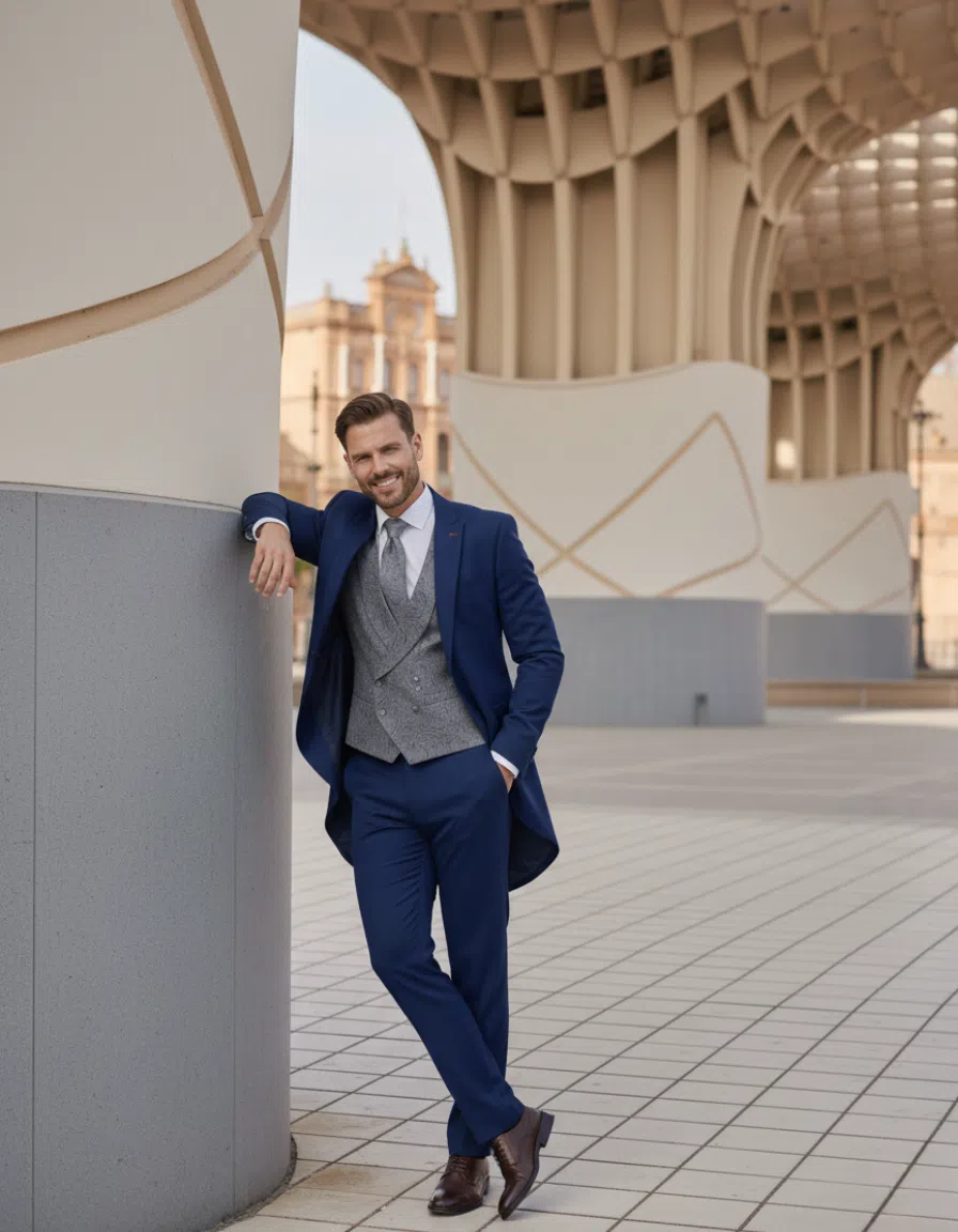 Siluetas favorecedoras | El traje de corte entallado favorece a novios que desean proyectar frescura y luminosidad, ya que estiliza la figura y aporta un aire natural y elegante. El chaleco coordinado aporta equilibrio al conjunto, mientras que la pajarita a juego añade un toque clásico y refinado. Perfecto para novios que buscan un look sofisticado pero desenfadado. |