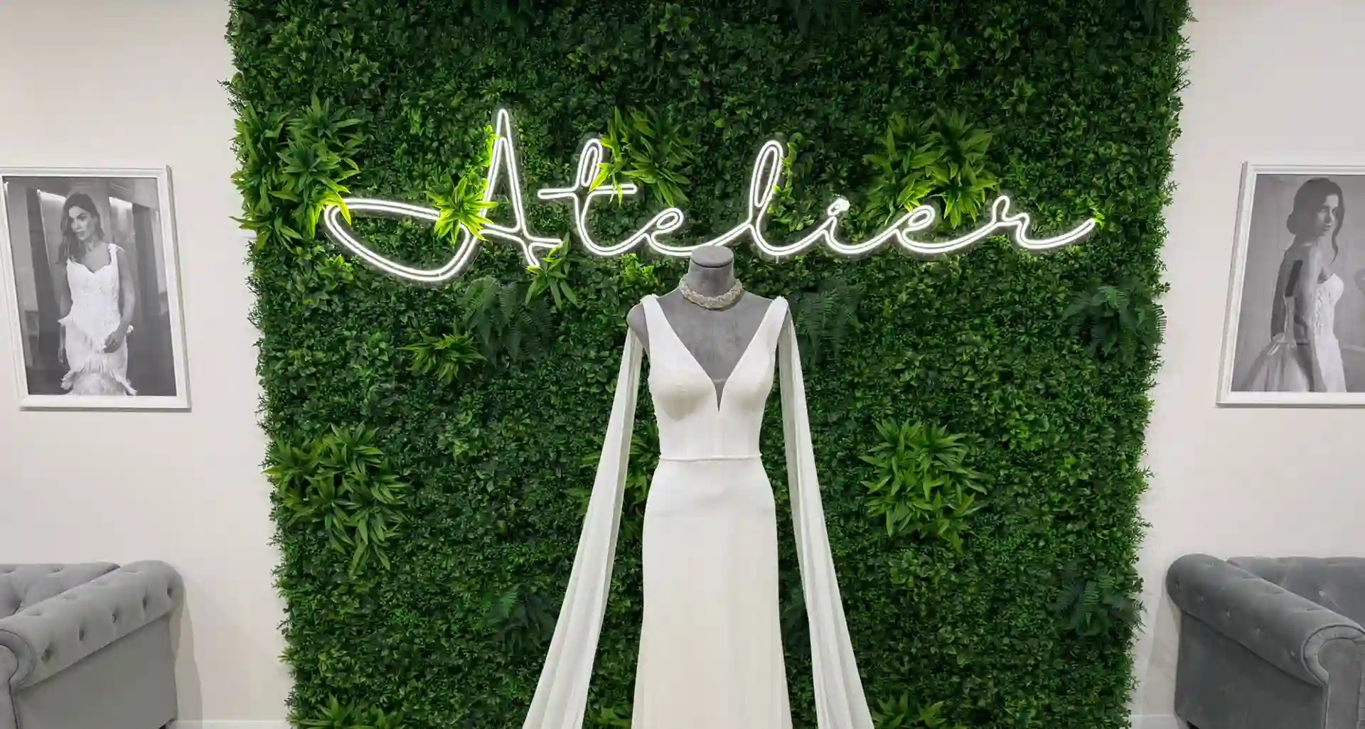 El secreto a salvo: Las colecciones de novia y novio están ubicadas en zonas totalmente independientes. Podéis venir juntos al Atelier, pero cada uno vivirá su prueba en su propia burbuja. El first look en el altar está garantizado.